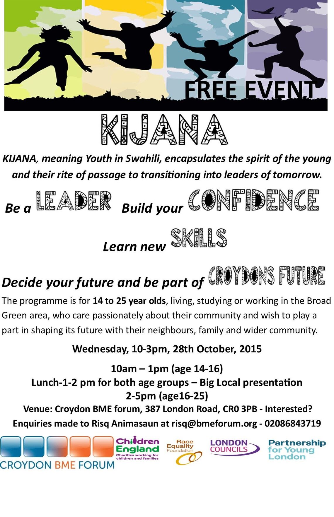 Kijana, means young in Swahilli, and this programme is based on the rites of passage. It will help young people to transition from young to adulthood. It is designed to develop character and enrich future Croydon leaders. It aims to build confidence, teach new skills and help to give voice to the future leaders of Croydon.