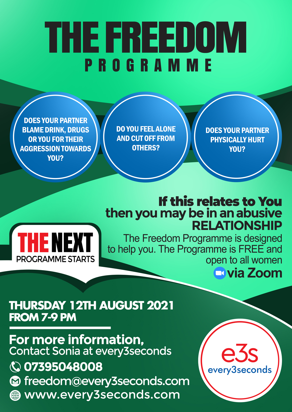 A 12 week programme starting 12 August 2021 free to all women who are in or have been in an abusive relationship.