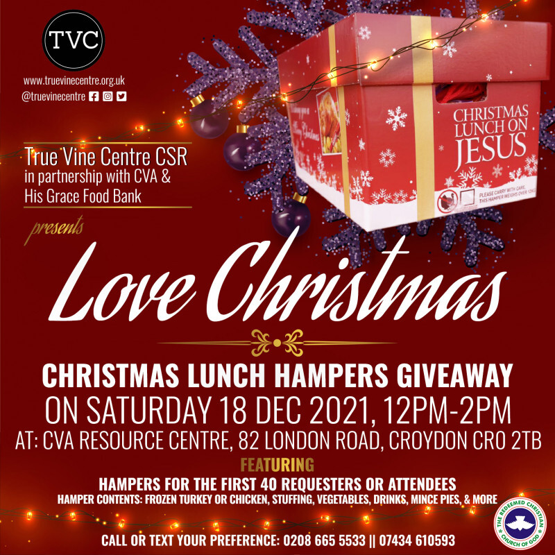 Hampers contain: frozen turkey or chicken; stuffing; vegetables; drinks; mince pies; and more. Call or text your preference 07434 610593.