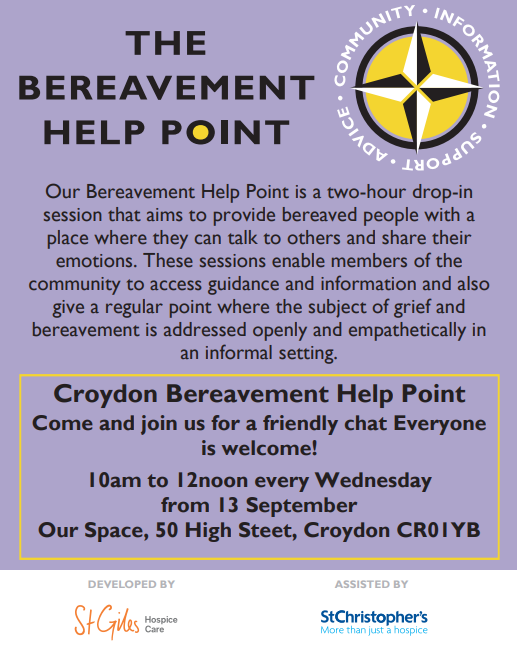 Our Bereavement Help Point is a two-hour drop-in session that aims to provide bereaved people with a place where they can talk to others and share their emotions. These sessions enable members of the community to access guidance and information and also give a regular point where the subject of grief and bereavement is addressed openly and empathetically in an informal setting.