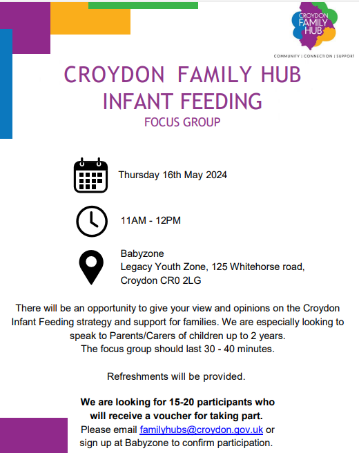 There will be an opportunity to give your view and opinions on the Croydon Infant Feeding strategy and support for families. We are especially looking to speak to Parents/Carers of children up to 2 years.