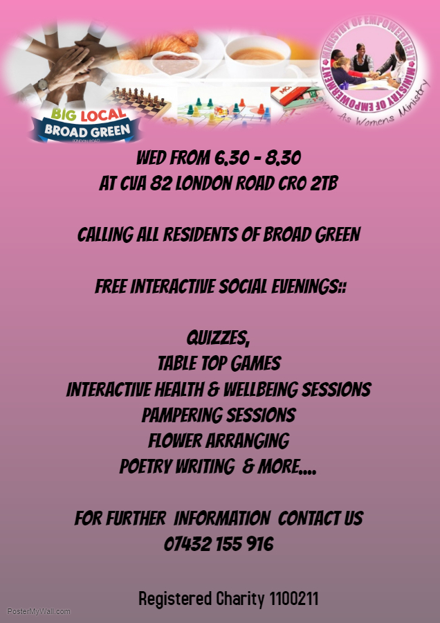 Lots of (free) activities are offered for the residents of Broad Green including: quizzes; table top games; interactive health and wellbeing sessions; pampering sessions; flower arranging; poetry writing; knitting; crocheting; raffle prizes.