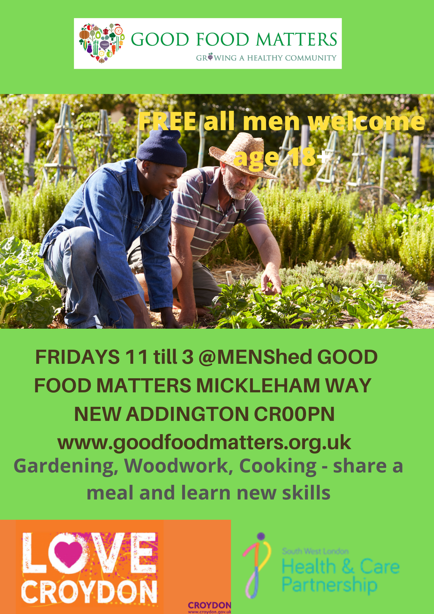 - The MENSHED Project offers a space for men age 18+ to come together in shared enjoyment with practical, hands-on gardening with all the health and wellbeing benefits of being outdoors, being physically active, having fun and sharing skills and enjoying home-grown vegetable and fruit produce. Every Friday from 11:00 – 15:00. W: www.goodfoodmatters.org.uk | E: amanda@goodfoodmatters.org.uk
